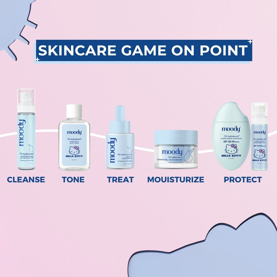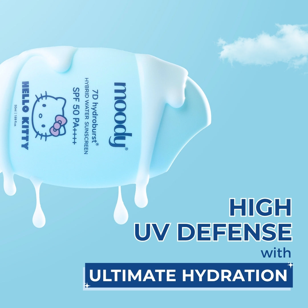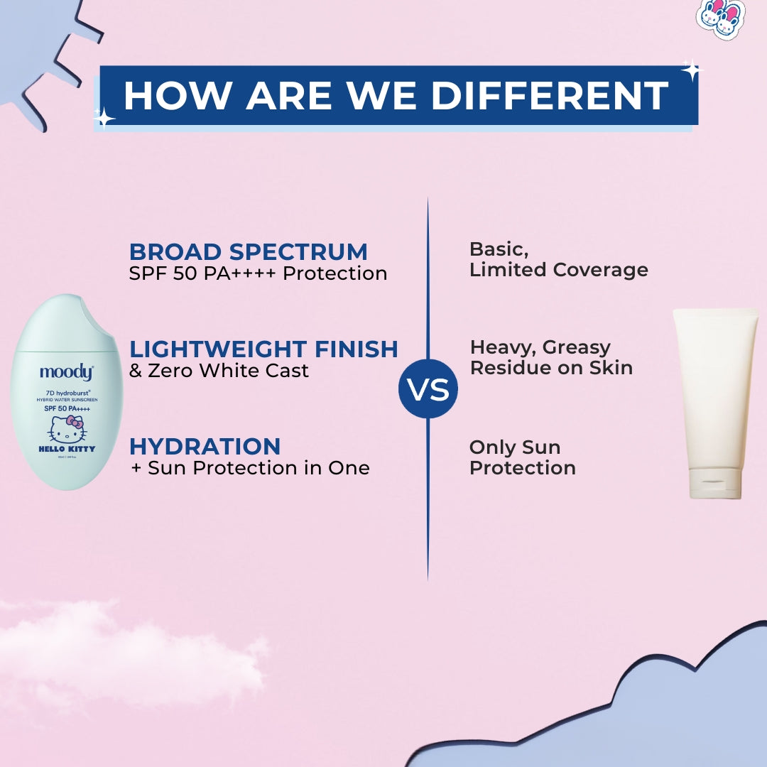 - The Hydro Burst Water Sunscreen SPF 50 PA++++ – Hello Kitty Limited Edition is infused with Hyaluronic Acid to deliver deep, lasting hydration while keeping your skin fresh, plump, and non-greasy all day long.